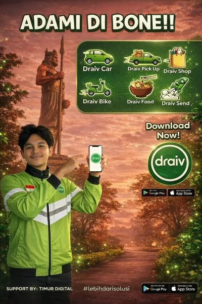 Kini hadir Aplikasi DRAIV Bone, layanan transportasi dan pesan antar makanan berbasis lokal yang menjangkau seluruh kelurahan di Tanete Riattang.